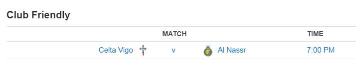 Al Nassr của Cristiano Ronaldo sẽ có trận đấu giao hữu với Celta Vigo trong lịch thi đấu bóng đá ngày 17/07/2023 mà nhà cái uy tín vừa cập nhật. Giải bóng đá quốc gia Ả Rập Xê Út đang là điểm đến của các ngôi sao hàng đầu thế giới.