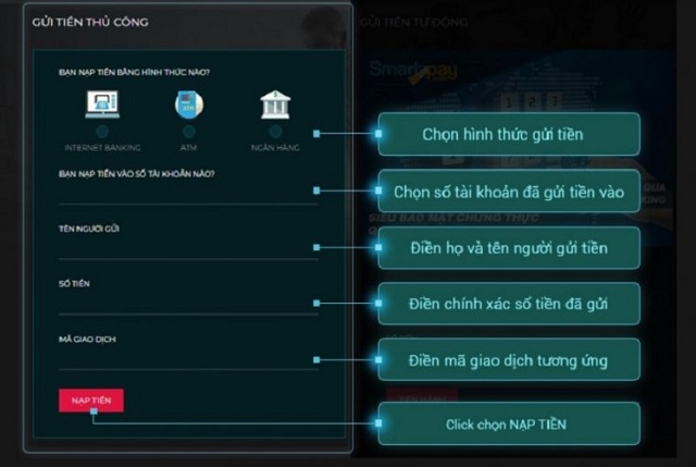 - Hình thức gửi tiền: Người chơi chọn một trong những hình thức nạp tiền trong số những hình thức Internet Banking, ATM, Ngân Hàng